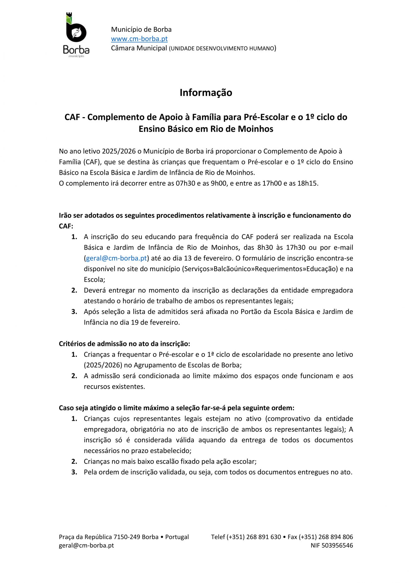 A implementação do CAF constitui um importante apoio às famílias, contribuindo para a conciliação da vida familiar e profissional, ao mesmo tempo que assegura condições de segurança, conforto e tranquilidade para as crianças durante os períodos extra letivos.